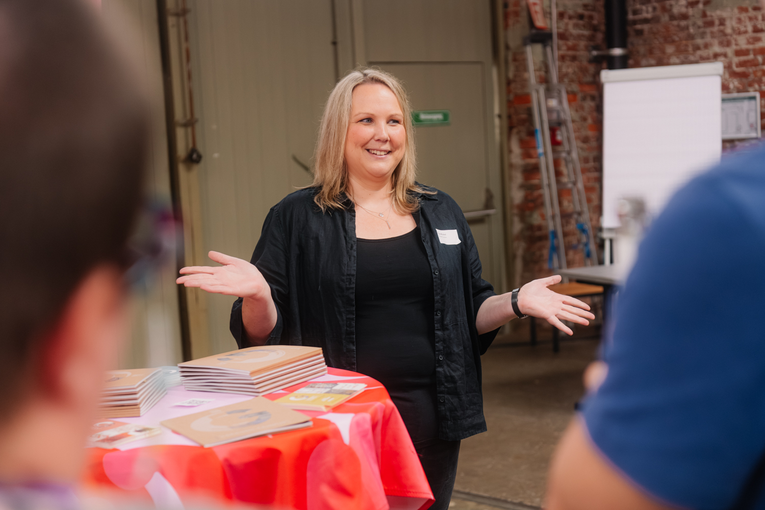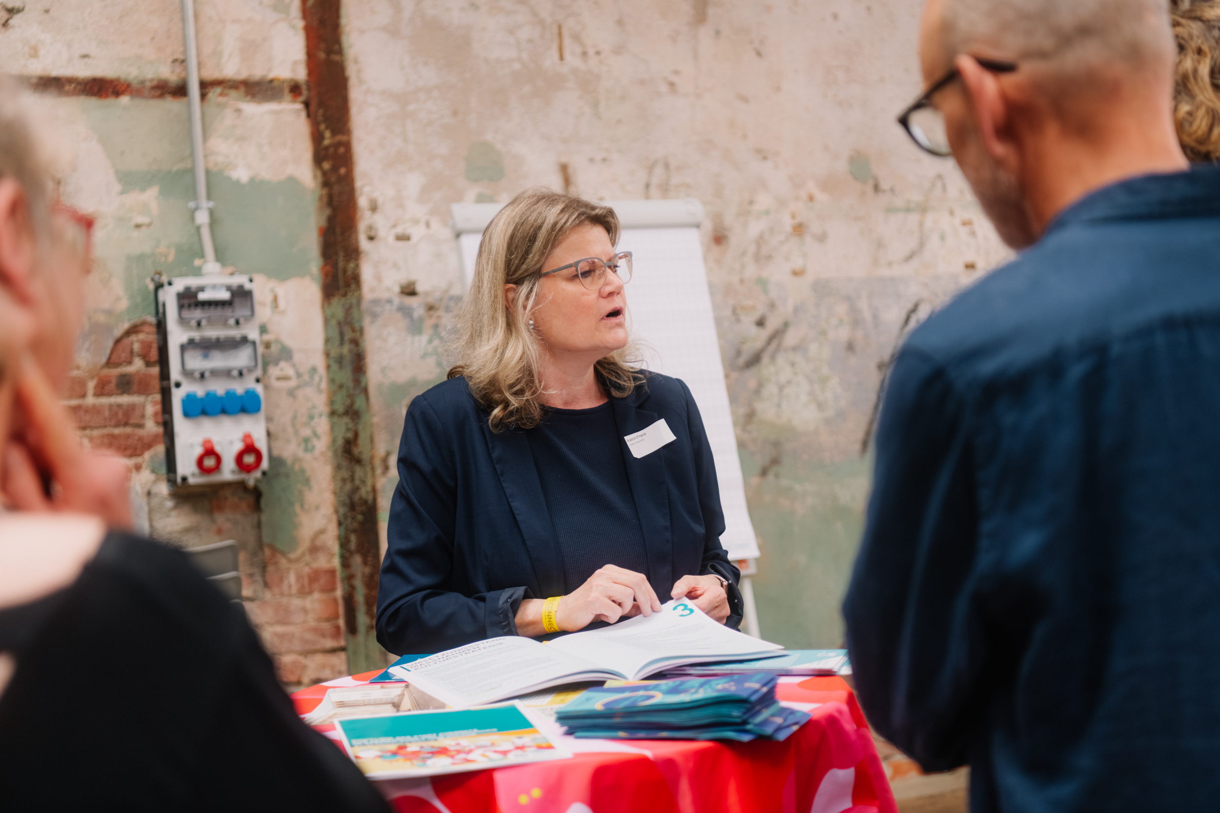 • eine Frau erklärt an einem Stehtisch ihre Organisation