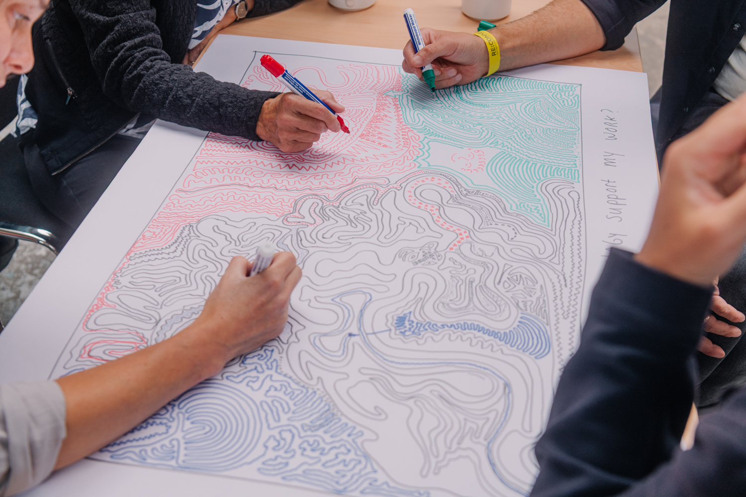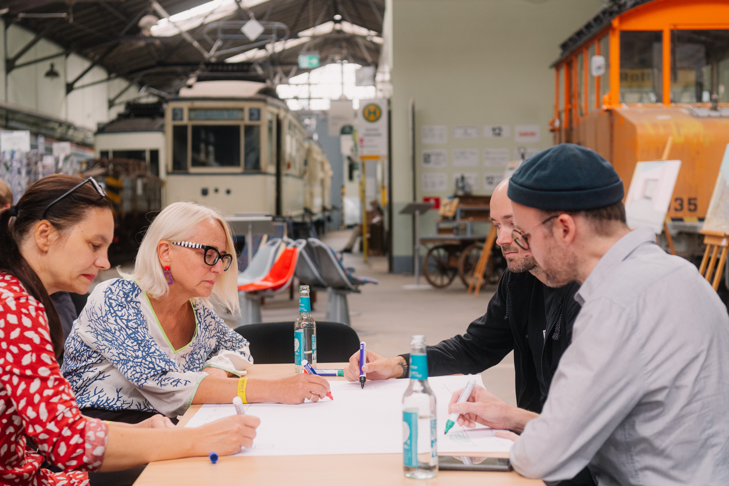 • vier Personen zeichnen gleichzeitig Linien auf ein Papier, während sie über Kulturthemen sprechen