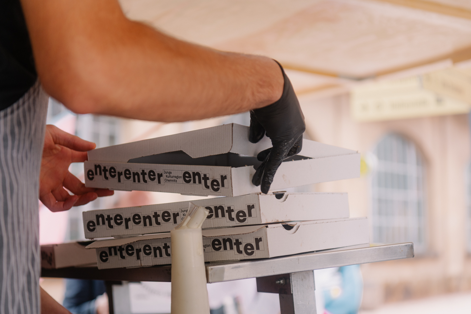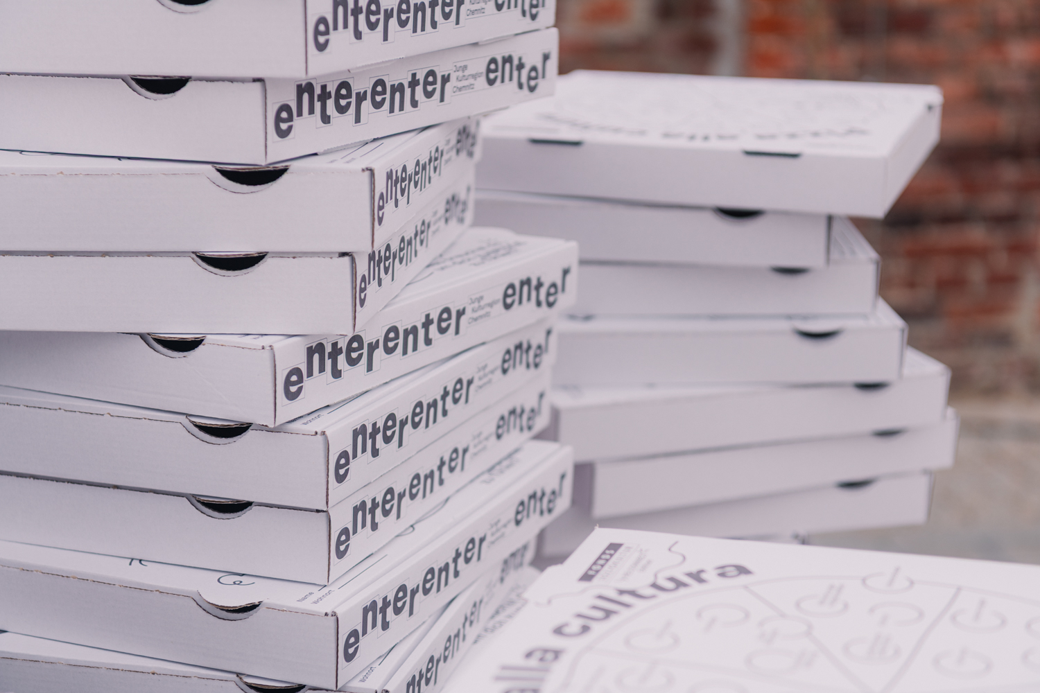 • ein Stapel designter Pizzakartons mit der seitlichen Aufschrift "enter"