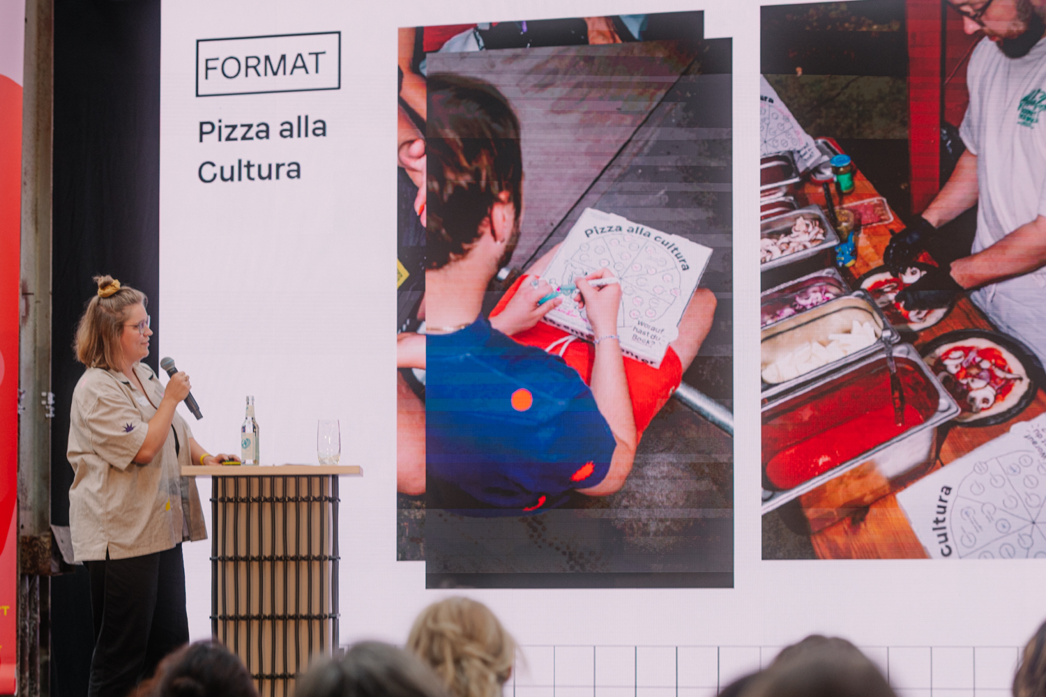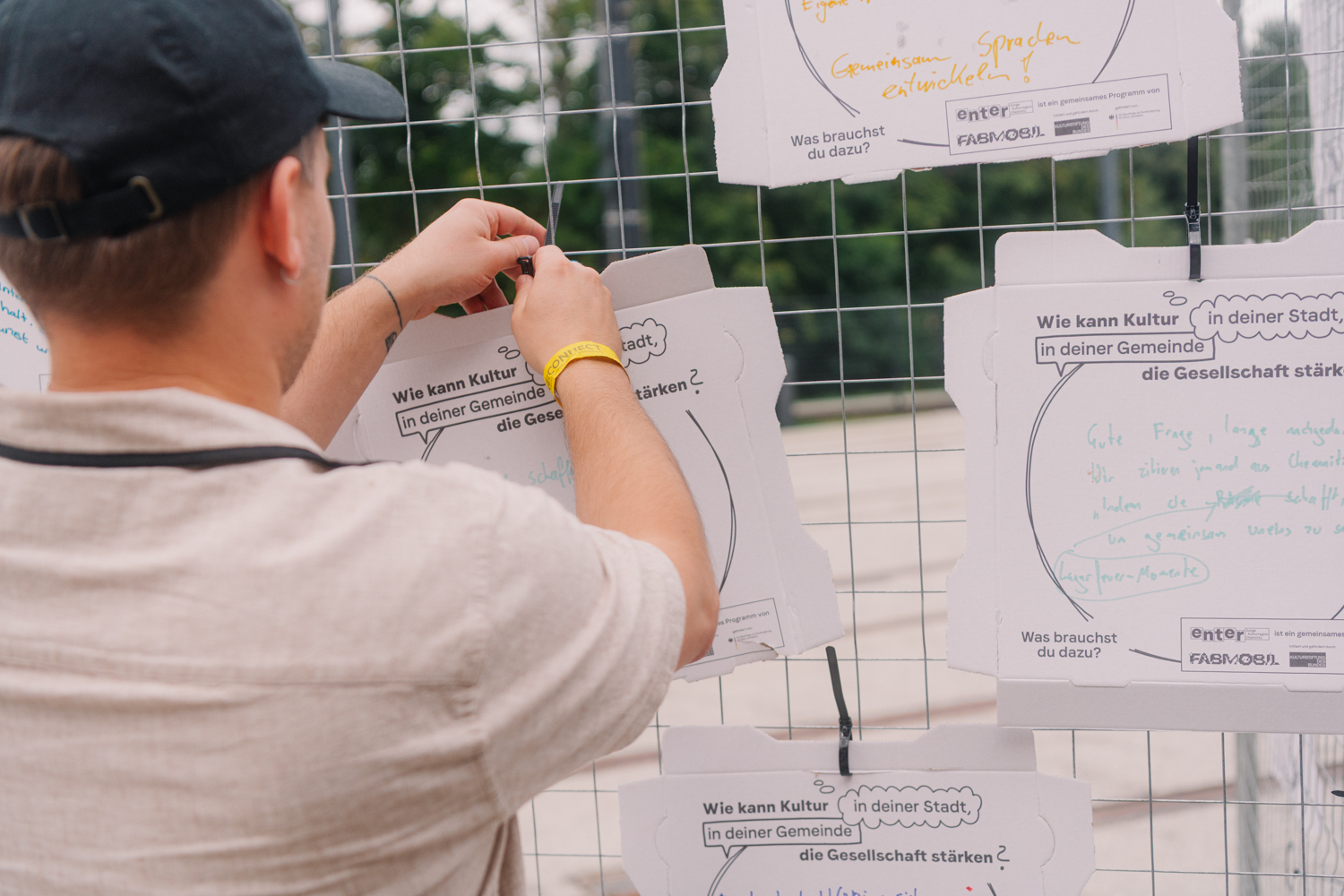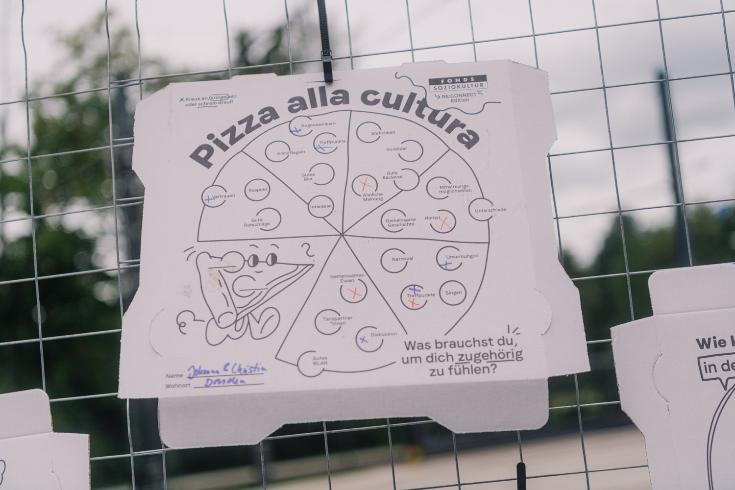 • eine Person hängt den Deckel eines Pizzakartons an ein Gitter. Darauf steht die Frage Wie kann Kultur in deinem Ort die Gemeinschaft stärken?