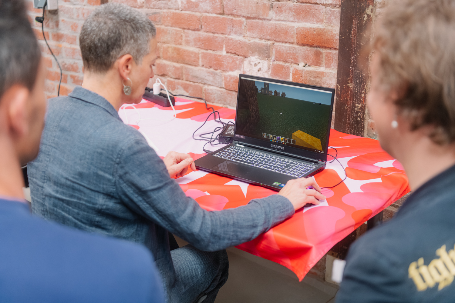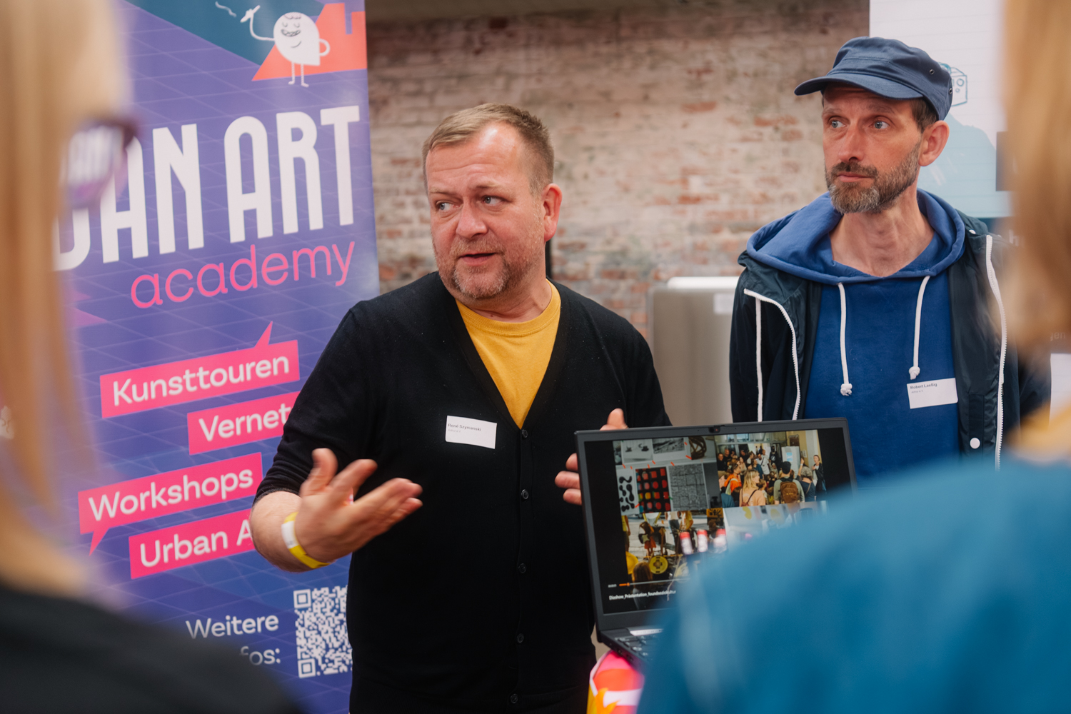 • zwei Personen erklären an einem Screen den Workshopablauf