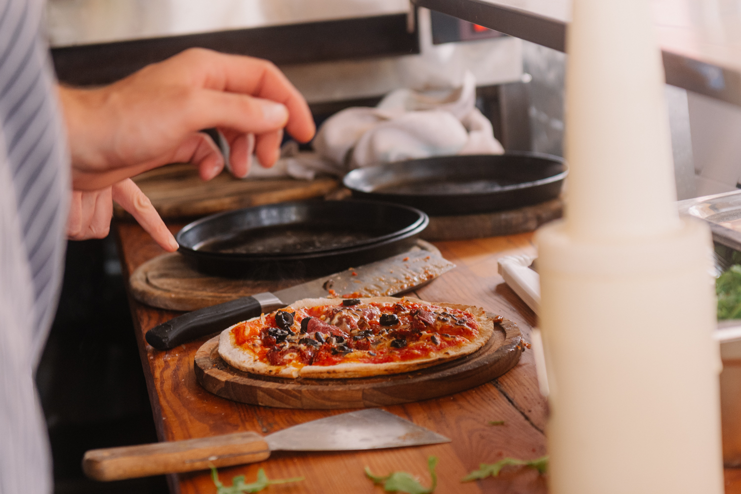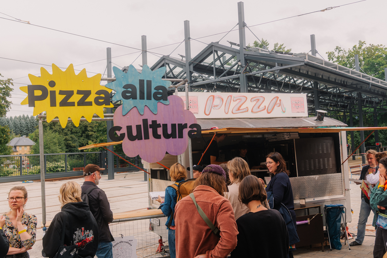 • ein Pizzawagen im Freien, um den sich Menschen sammeln