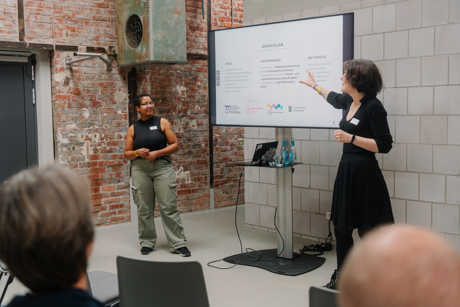 • zwei Personen stehen neben einem Bildschirm und erklären das "data:viz:lab"