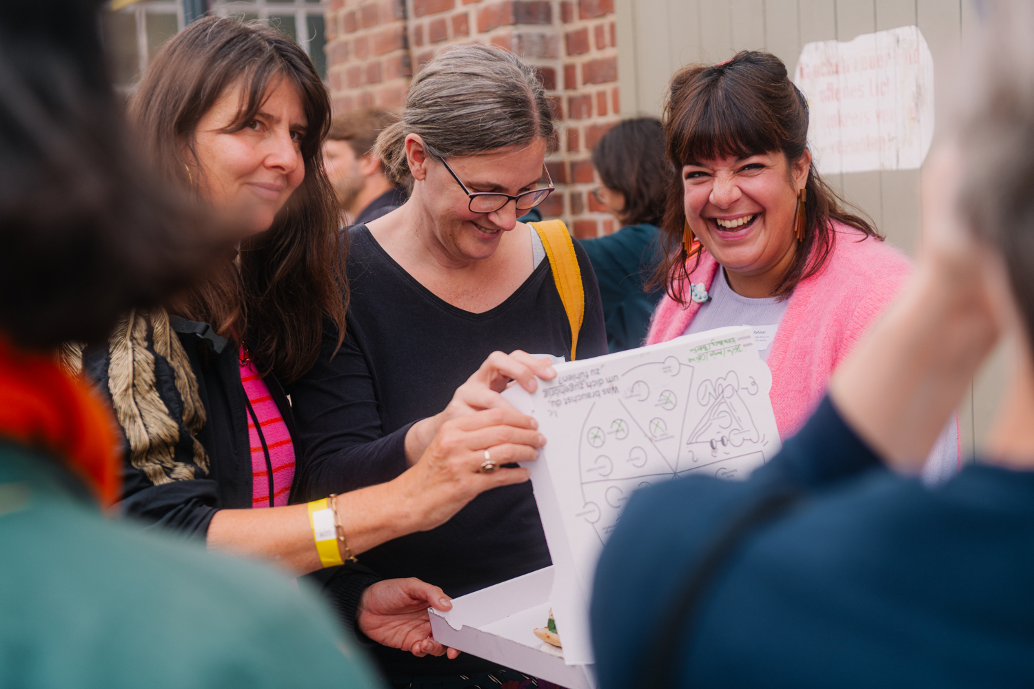 • drei Personen öffnen lachend einen gestalteten Pizzakarton