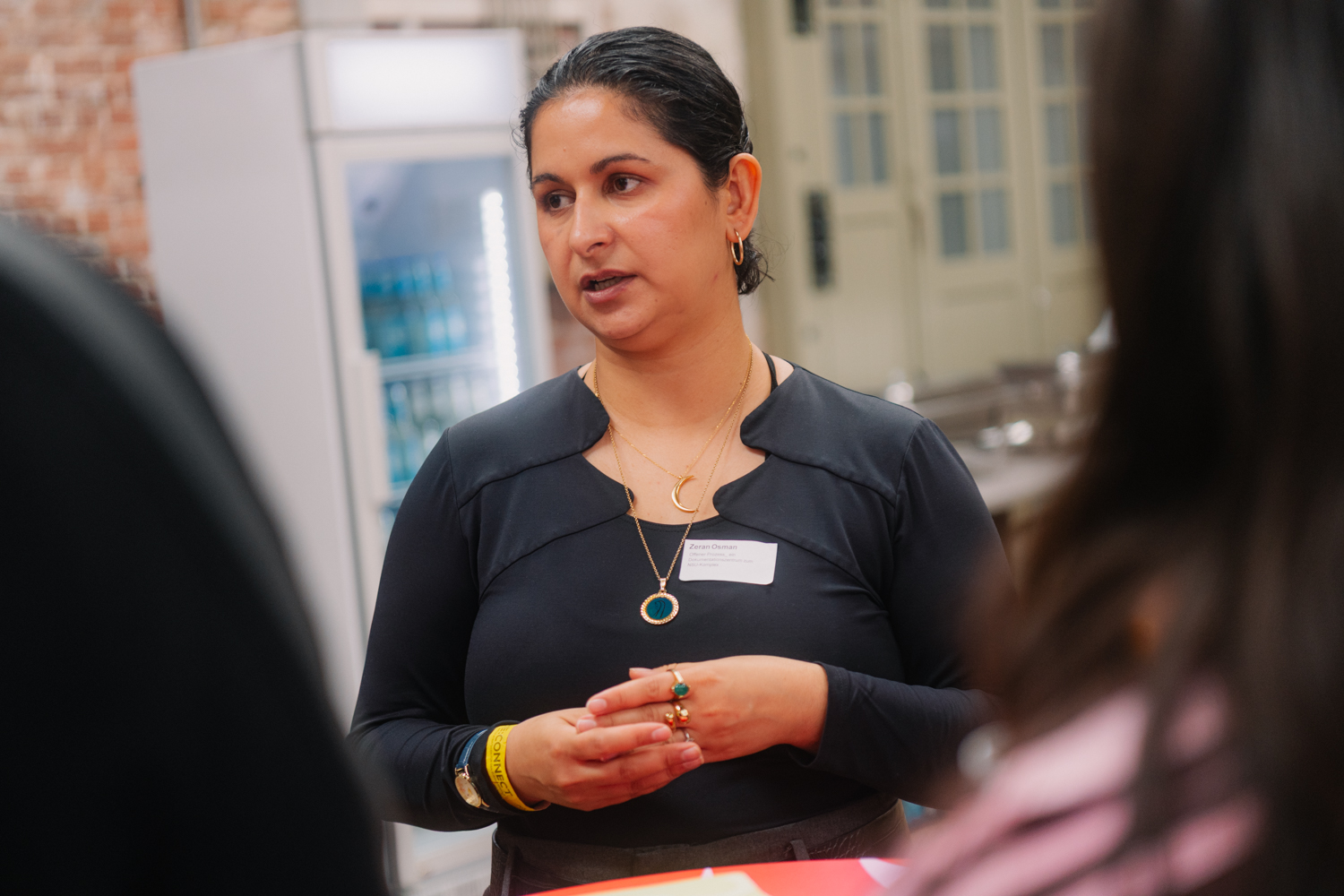 • eine Person erzählt an einem Stehtisch mit mehreren Personen von ihrer Kulturorganisation