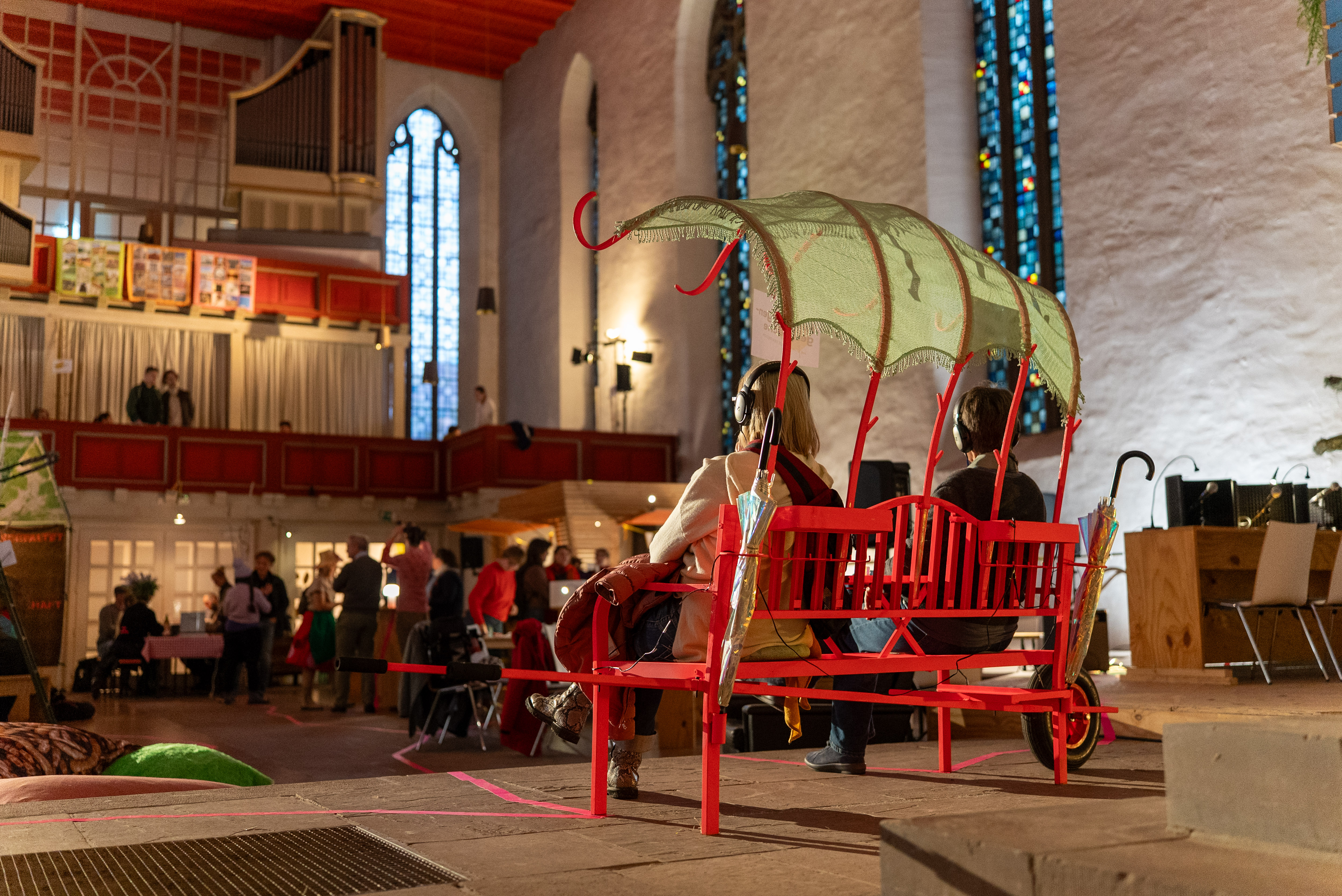 • Zwei Personen sitzen auf einer roten Bank mit einem Rosenbogen ähnlichen Sonnendach in einem Kirchenraum mit Menschen im Hintergrund