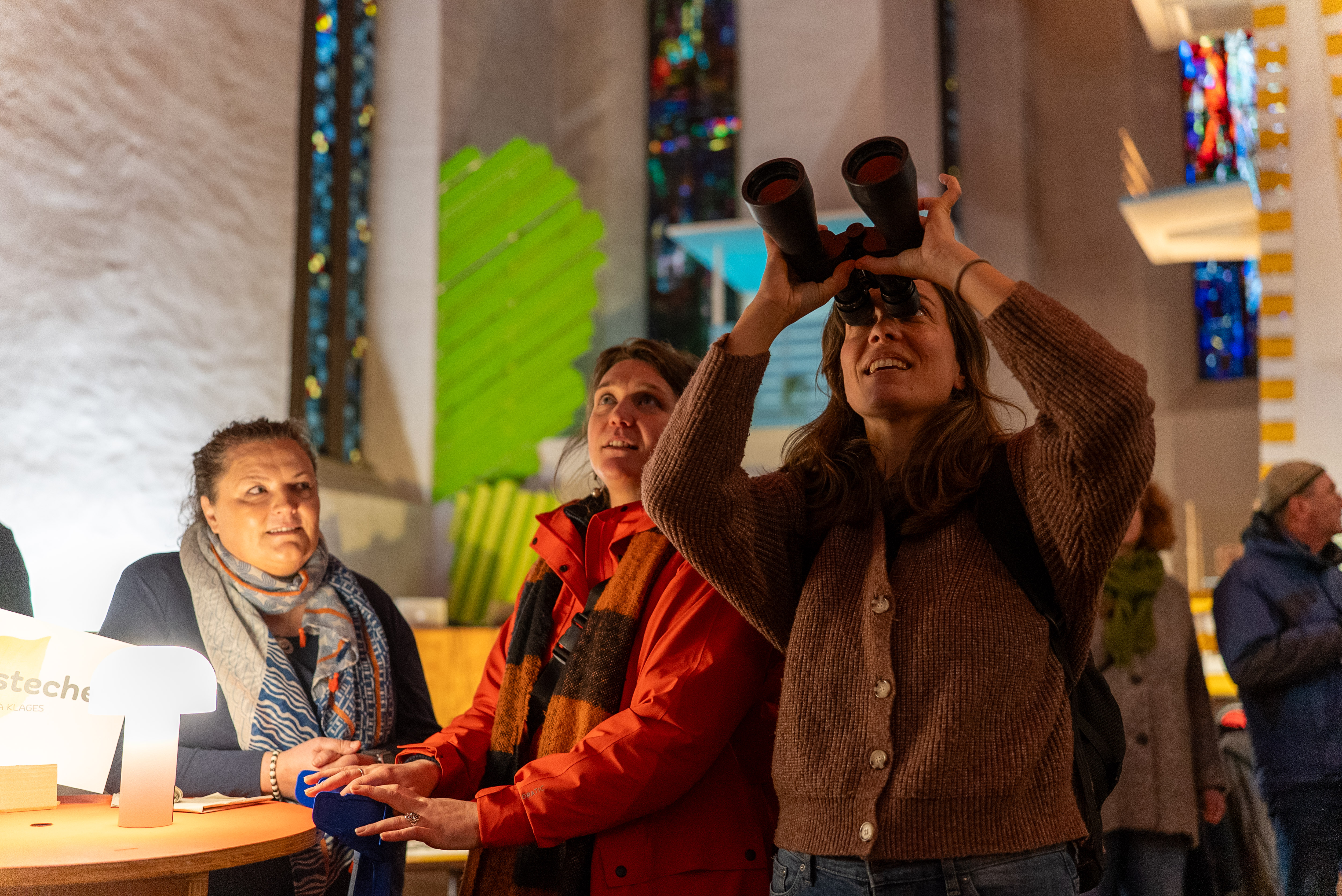 • Drei Personen in einem Innenraum mit bunten Glasfenstern, eine Person hält ein Fernglas nach oben gerichtet