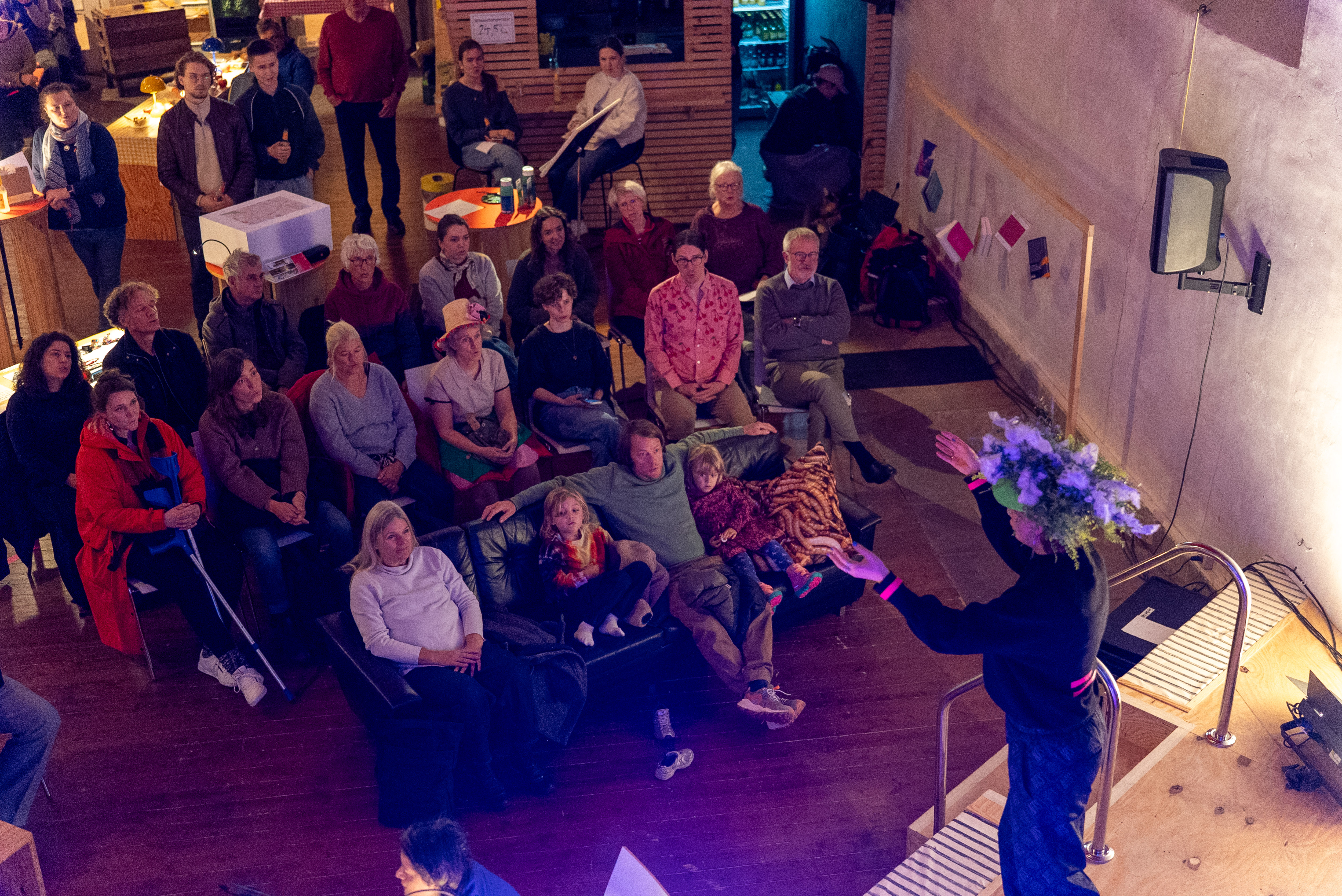 • Person steht auf einer Bühne und spricht vor einem Publikum, das auf Stühlen und Sofas sitzt