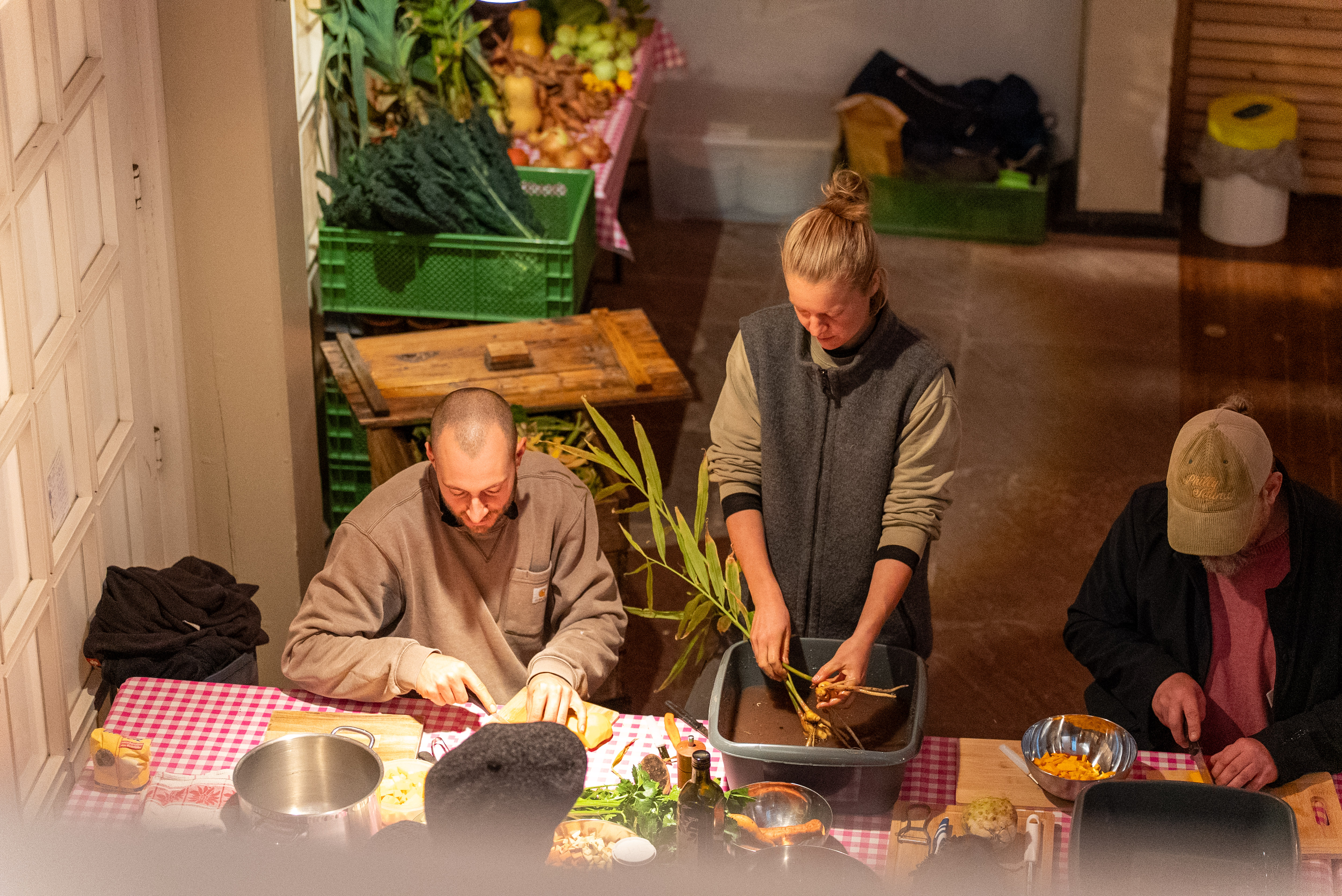 • Drei Personen sitzen an einem Tisch und bereiten Gemüse zu, im Hintergrund Obst- und Gemüsekisten.