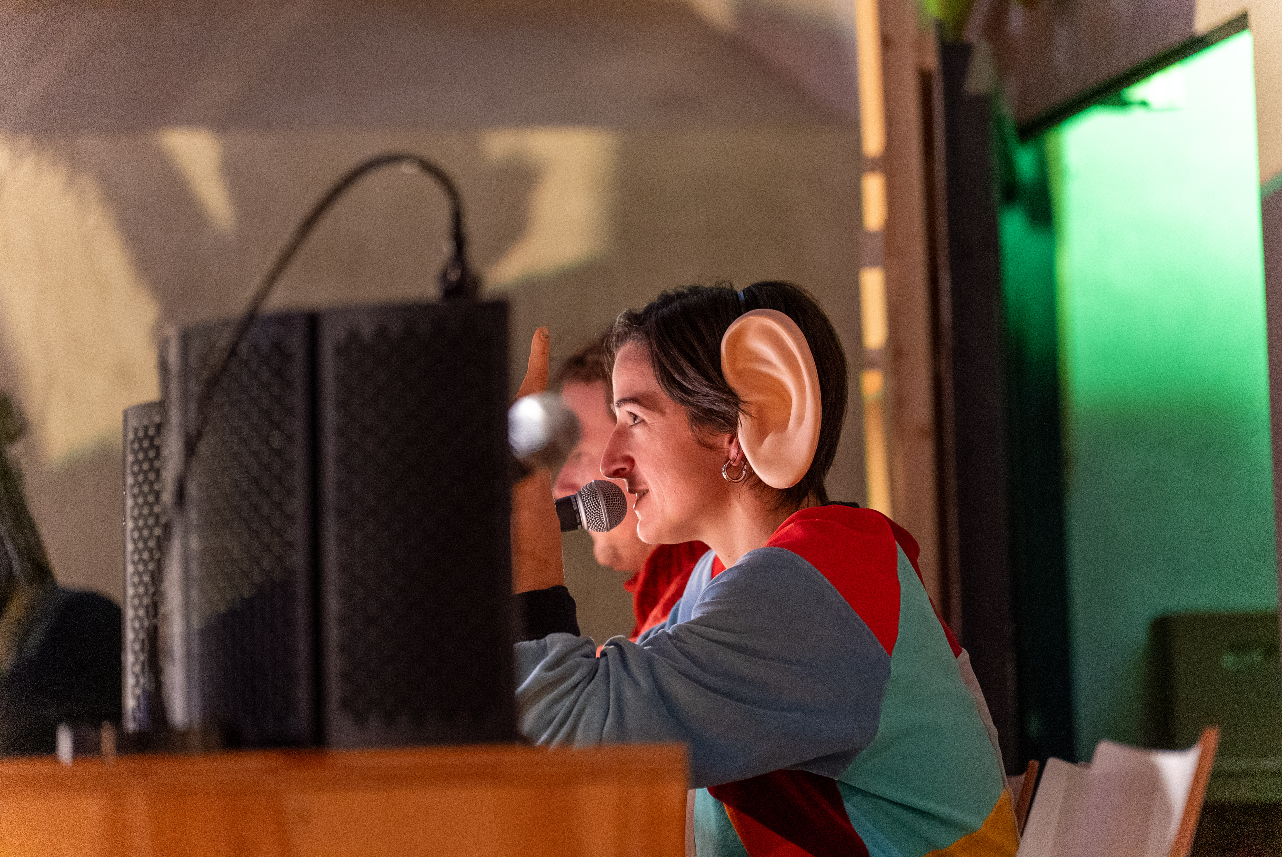 • Person mit übergroßem, künstlichem Ohr sitzt an einem Tisch mit Mikrofon und Lautsprechern im Hintergrund