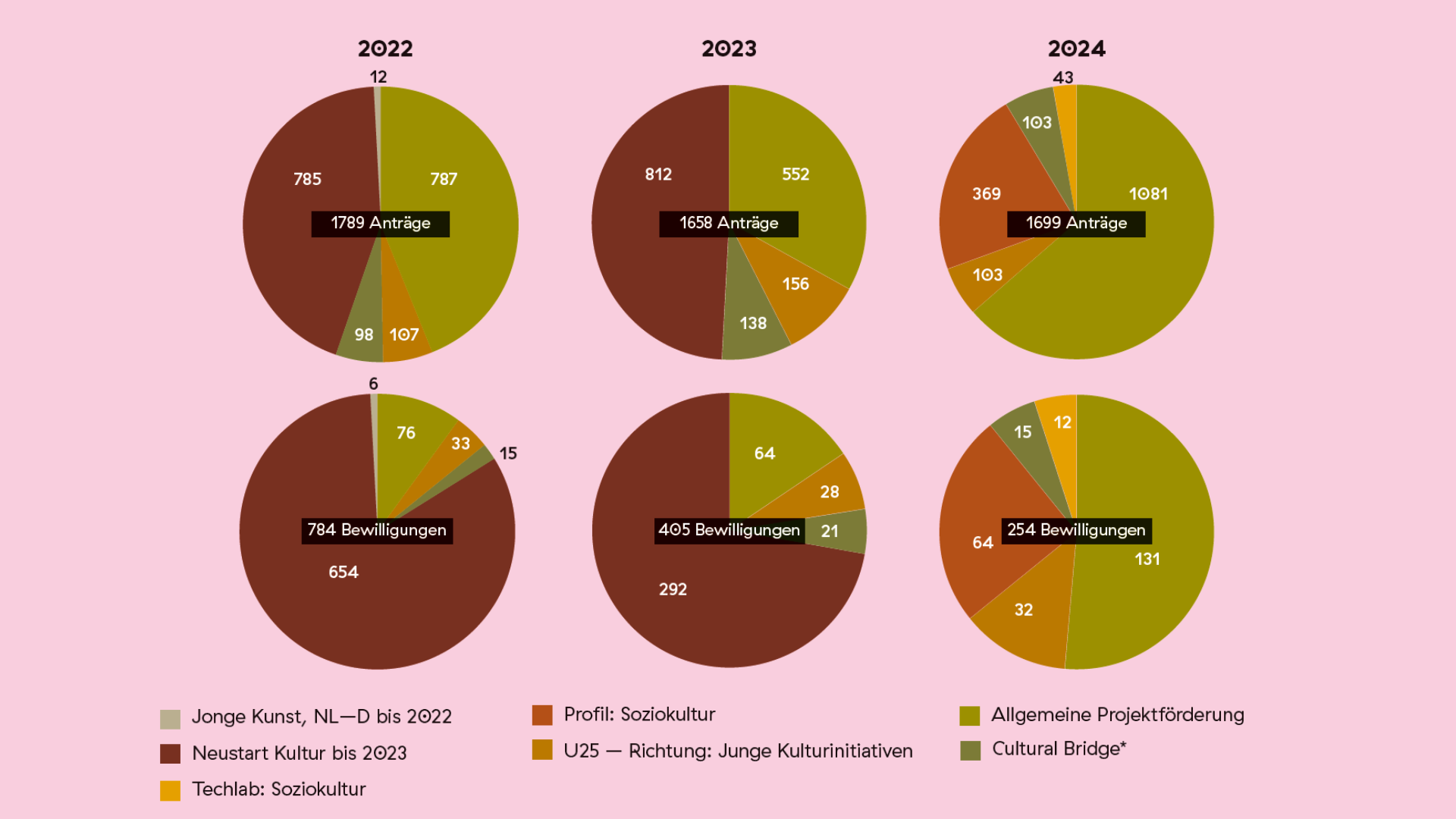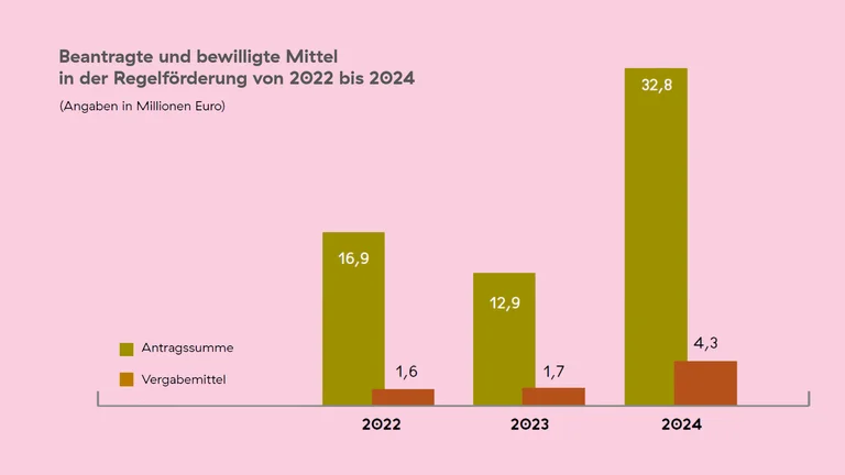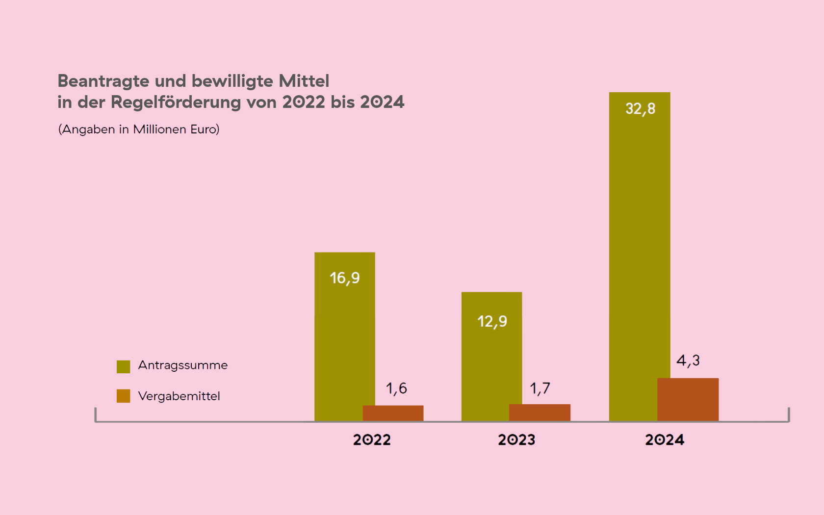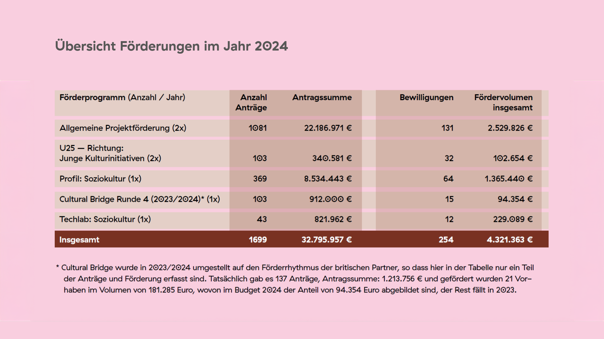 The year 2024 marks a special milestone in every respect. Thanks to increased funding from the Federal Government Commissioner for Culture and the Media (BKM), more than twice as much funding was available. With a funding rate of 15 percent, a wide range of socio-cultural projects, organisational development and digital innovation were supported in five different funding programmes with a total of seven calls for proposals.